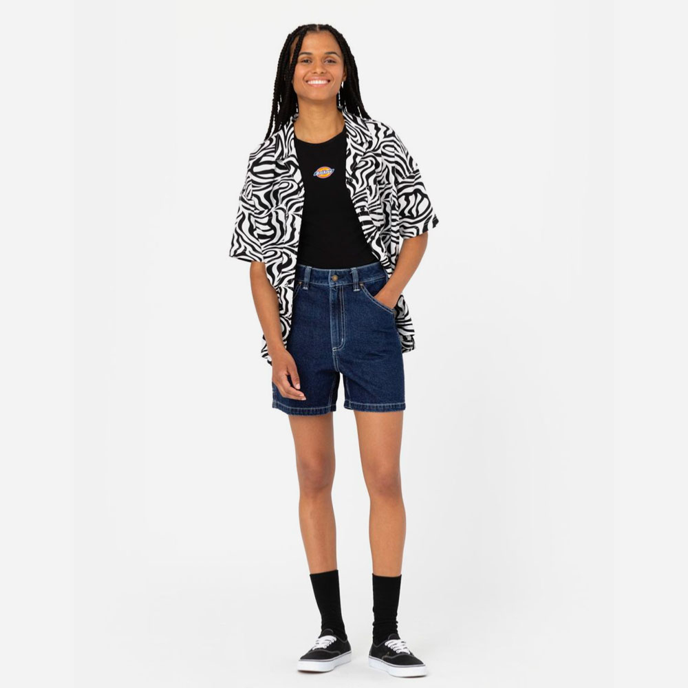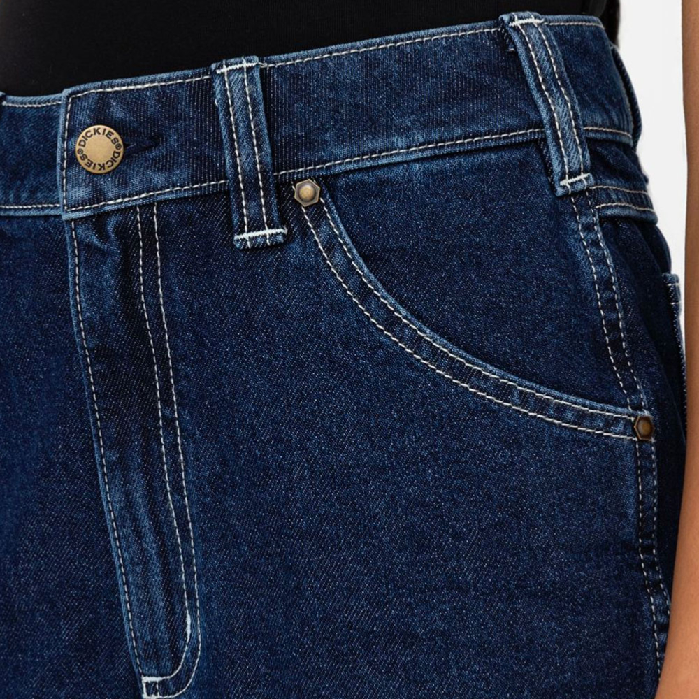 Short en jean coupe droite taille haute, avec plusieurs poches utilitaire. Fabriqué dans un denim résistant 350g avec des coutures contrastantes. Logo Dickies sur la poche arrière