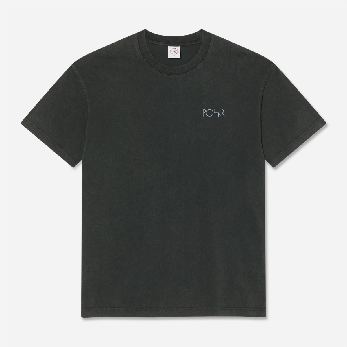 T-shirt Polar manches courte, coupe classique avec épaules légèrement tombantes et col ras du cou côtelé fabriqué dans un coton noir délavé épais pré-rétréci. Photo de Sirus F Gahan sérigraphié dans le dos et logo Polar ton sur ton sur la poitrine.